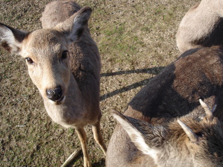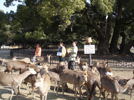 出了奈良車站後,隨即搭上往春日大社前的「飛火野」等待「鹿寄」,「鹿寄」原是在若草山上表演給明治天皇看的歡迎儀式,當地人士在餵食鹿群時輔以號角聲,之後只要號角一響,鹿群即聚集起來等吃的,成群結隊的鹿群從四面八方蜂擁而至,宛若神的使者降臨的祥瑞模樣,的確讓明治天皇龍心大悅!自此之後就變成奈良吸引觀光客的一個噱頭了!但不知為何,網站明明說是9點的,到那才發現活動是10點才開始,害的大家早起一個小時,真是不好意思!不過也因為很早到,我們在無人(只有鹿)的大草原上跟鹿鹿玩了(還是被他們玩?!)不算短的時間,阿蓬身上帶的2包營養口糧在很短的時間內馬上被鹿鹿吃的一乾二淨!