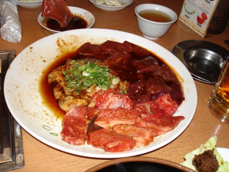 今天晚上是在日本的最後一個晚上,所謂有始有終嘛!既然第一天吃了年夜飯,臨走前當然也要來一份大餐囉!今天吃的是同行朋友推薦位於鶴橋燒肉街的第一間,有A套餐及B套餐,看不懂日文的我只見B套餐寫了一個「心」,想說大概B餐都是內臟類吧,還是點A好了,只是萬萬沒想到,B餐除了心是內臟外,其他都是肉,而A餐只有一種肉,其他都是內臟!真是Orz....