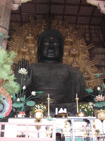 東大寺內的大佛殿是世界上現存最大的木構建築,內部供奉的銅大佛是日本第一大佛像,也是世界上最大的金銅佛像,被定為國寶。可能因為東大寺是8世紀仿造唐朝寺廟建造的,我覺得大佛給人一種很親切的感覺,臉上的線條很安詳平靜,總之,在大佛殿內靜靜的看覺得是一件很舒服的事。